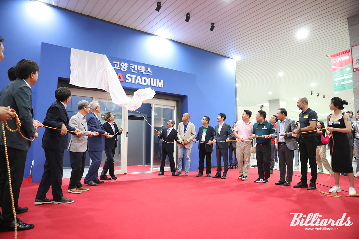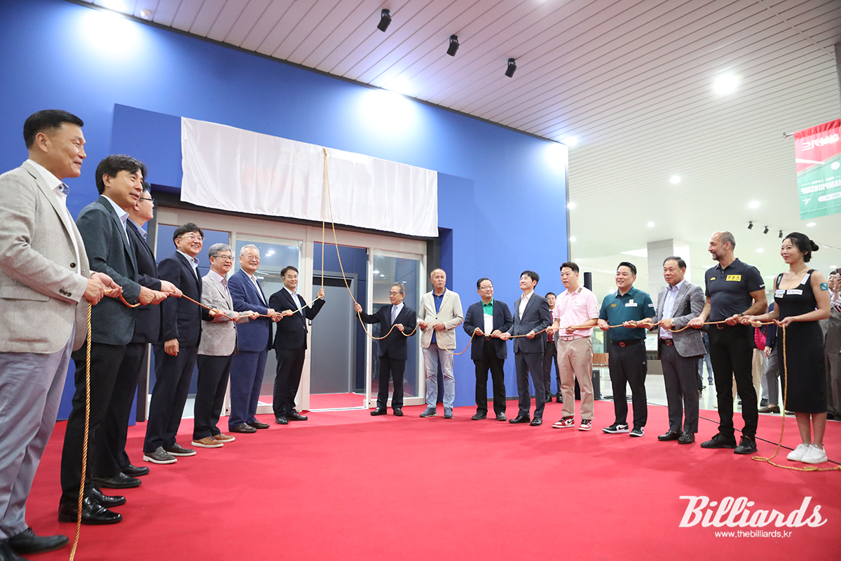 사진은 개장식에 참석한 내빈들과 당구선수를 대표한 조재호, 강동궁, 김가영, 세미 사이그너가 간판을 가린 흰 천을 함께 떼어내고 있다.