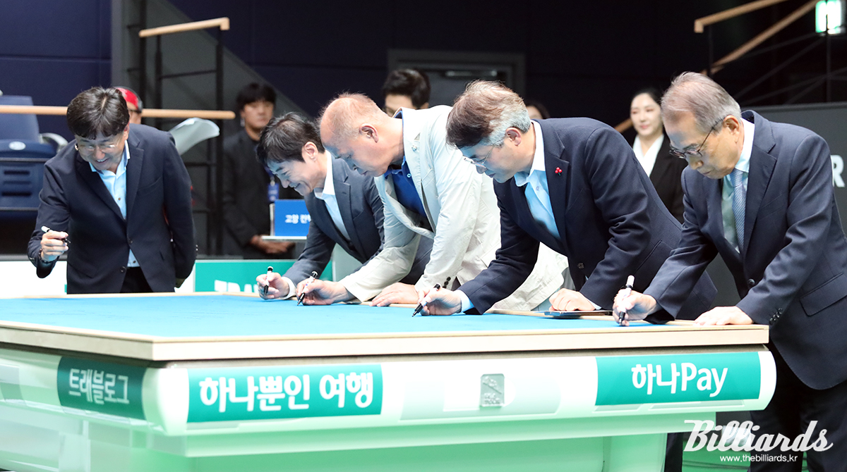사진은 방명록 대신 당구대 천 위에 사인을 남기는 내빈들. 왼쪽부터 PBA 장상진 부총재, 킨텍스 이재율 대표, 이용우 국회의원, 이동환 고양시장, PBA 김영수 총재.