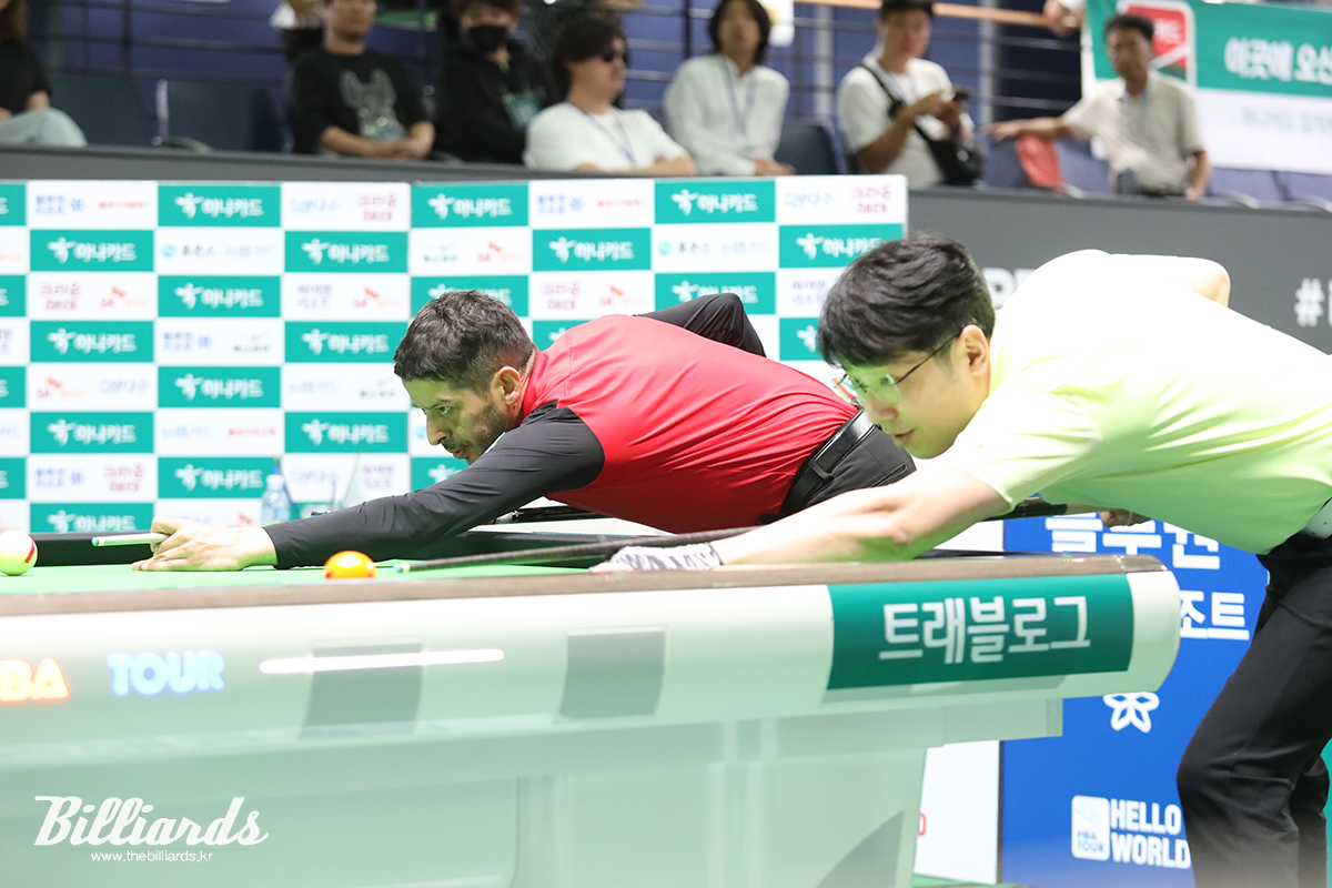 사진은 오늘(22일) 오후 3시 30분 '고양 킨텍스 PBA 스타디움'에서 열린 128강전에서 뱅킹을 하는 초클루와 오성욱.