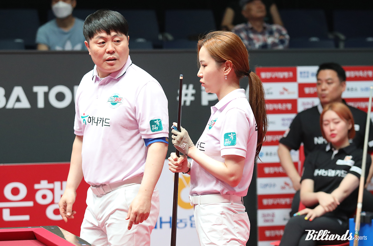 1세트를 하나카드의 신정주-무랏 나시 초클루가 조재호-김현우를 상대로 3이닝 만에 11:1로 승리한 가운데 2세트 여자 K-복식에서도 하나카드의 김가영이 초구에 6점을 몰아치며 NH농협카드의 김민아-김보미를 압박했다.