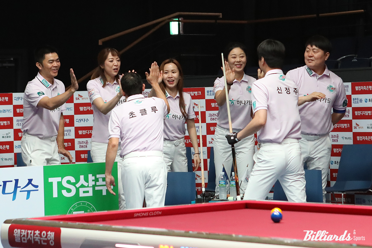 하나카드 하나페이의 신정주와 무랏 나시 초클루가 오늘(11일) 열린 '웰컴저축은행 PBA 팀리그 2023-24' 1라운드 마지막 대결에서 1세트에 NH농협카드 그린포스의 조재호-김현우를 3이닝 만에 11:1로 꺾고 첫 세트를 선취했다.