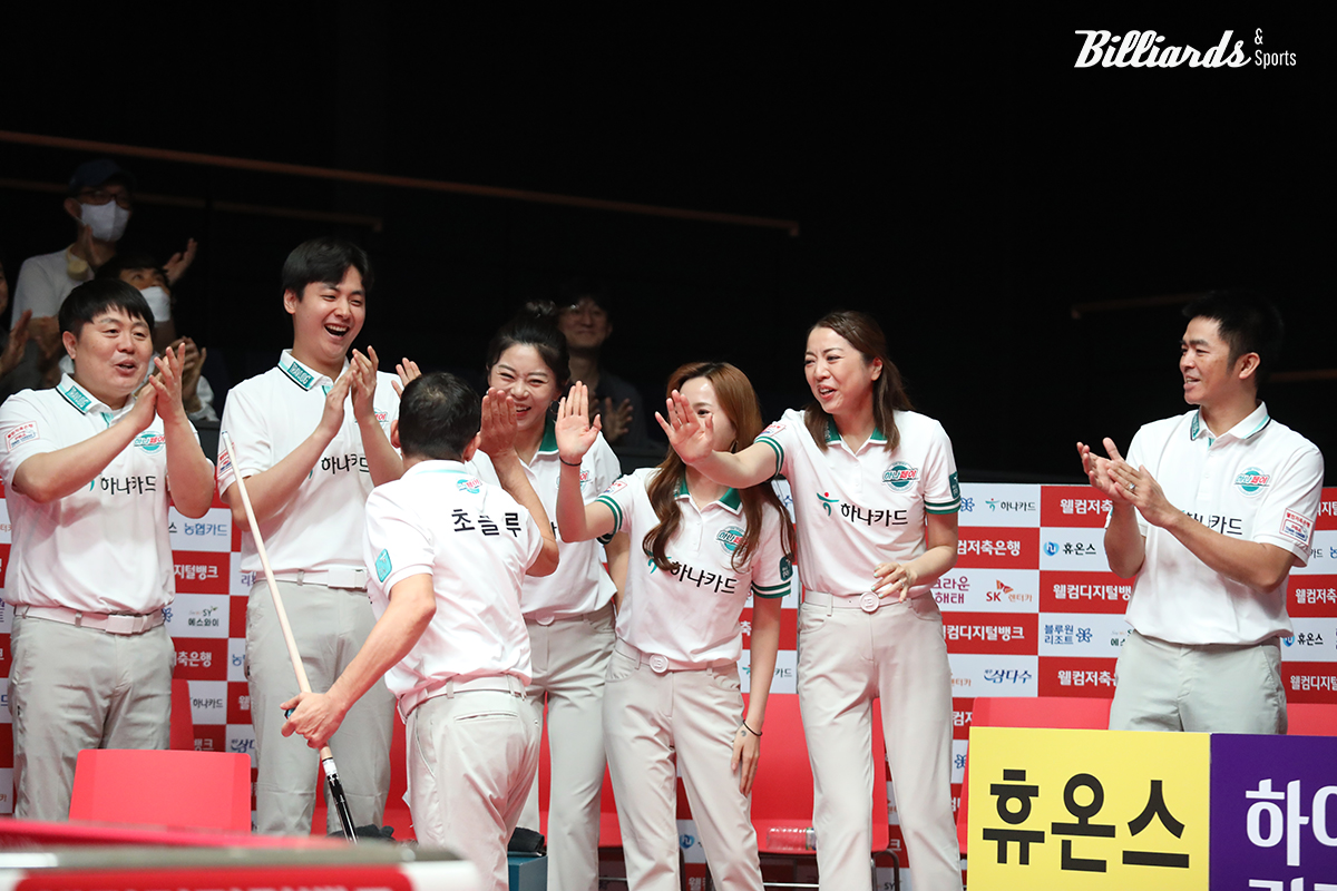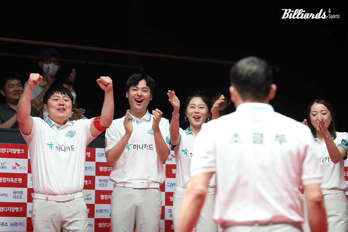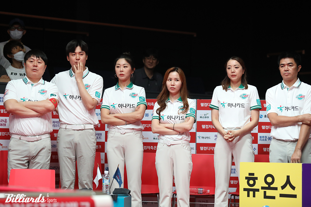 사진은 초클루의 마지막 샷을 지켜보는 하나카드 팀원들. 어려운 배치의 마지막 공을 심각하고 바라보고 있던 선수들이 심판의 득점 콜이 선언되자 깜짝 놀라며 환호하고 있다.