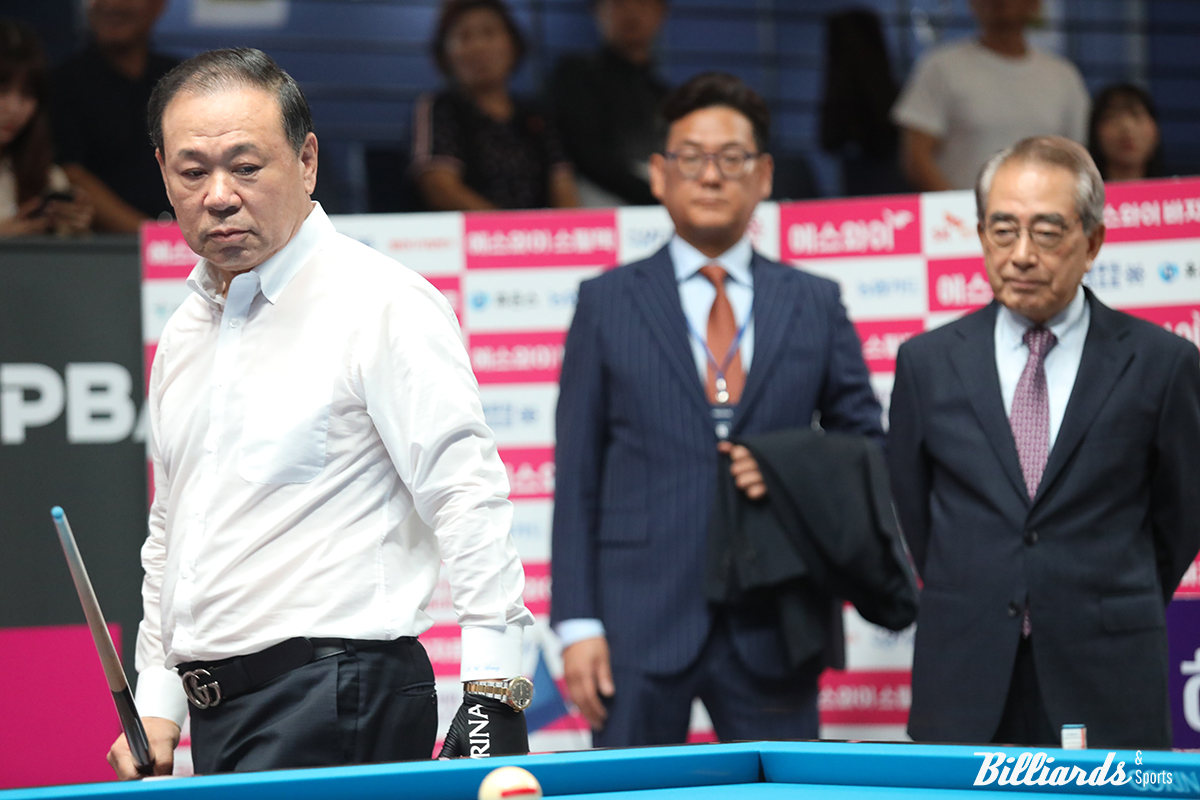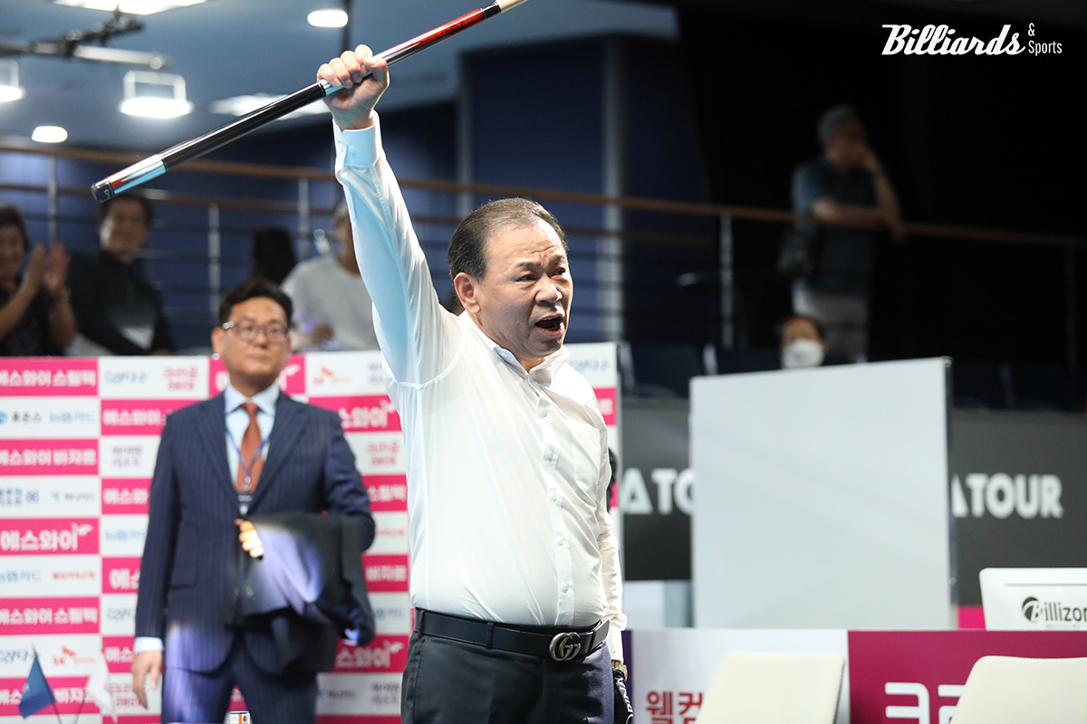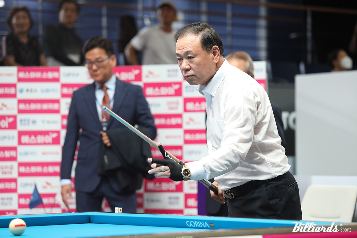 사진은 오늘 열린 개막식에서 시타를 준비하는 홍성균 에스와이 구단주. 신중한 샷으로 깔끔하게 시타에 성공한 홍성균 구단주가 한 손으로 큐를 번쩍 들자, 에스와이 바자르 선수들이 손뼉을 치며 환호하고 있다.