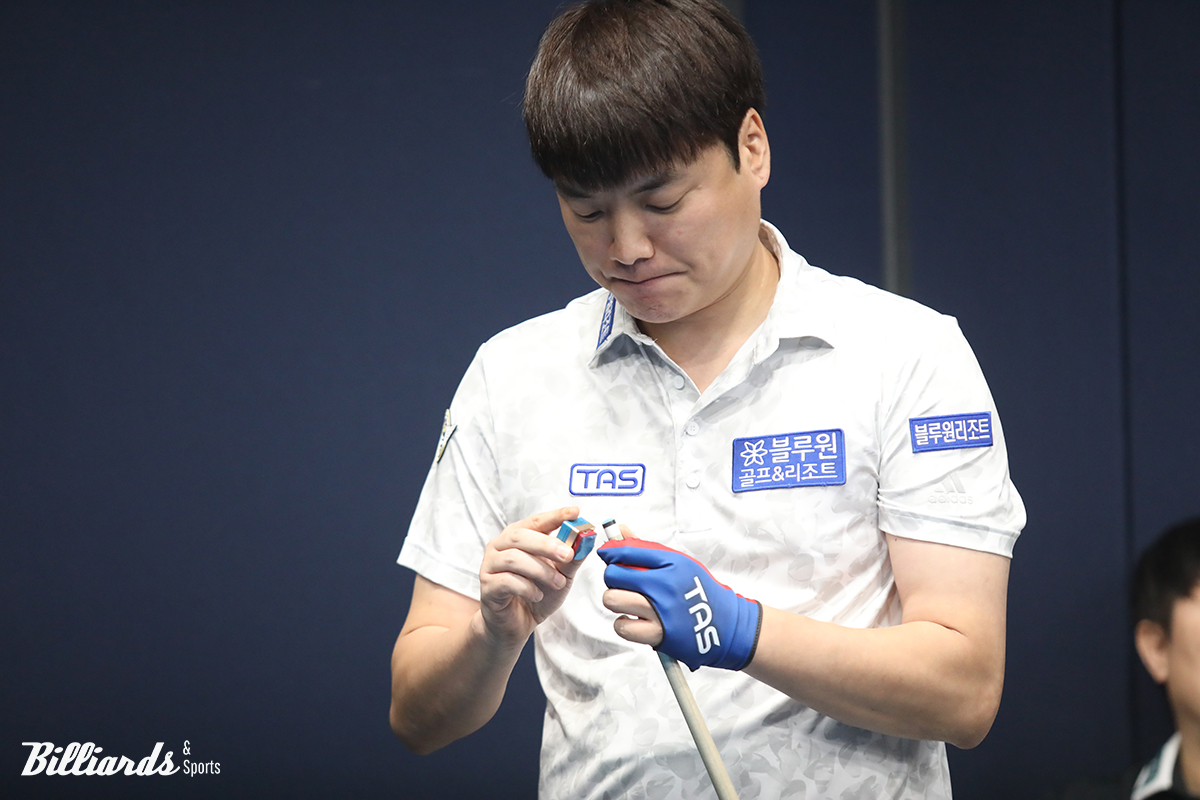 사진은 김병호와의 64강전에서 경기하는 강민구. 강민구가 큐 미스에 대비해 꼼꼼하게 초크 칠을 하고 있다.