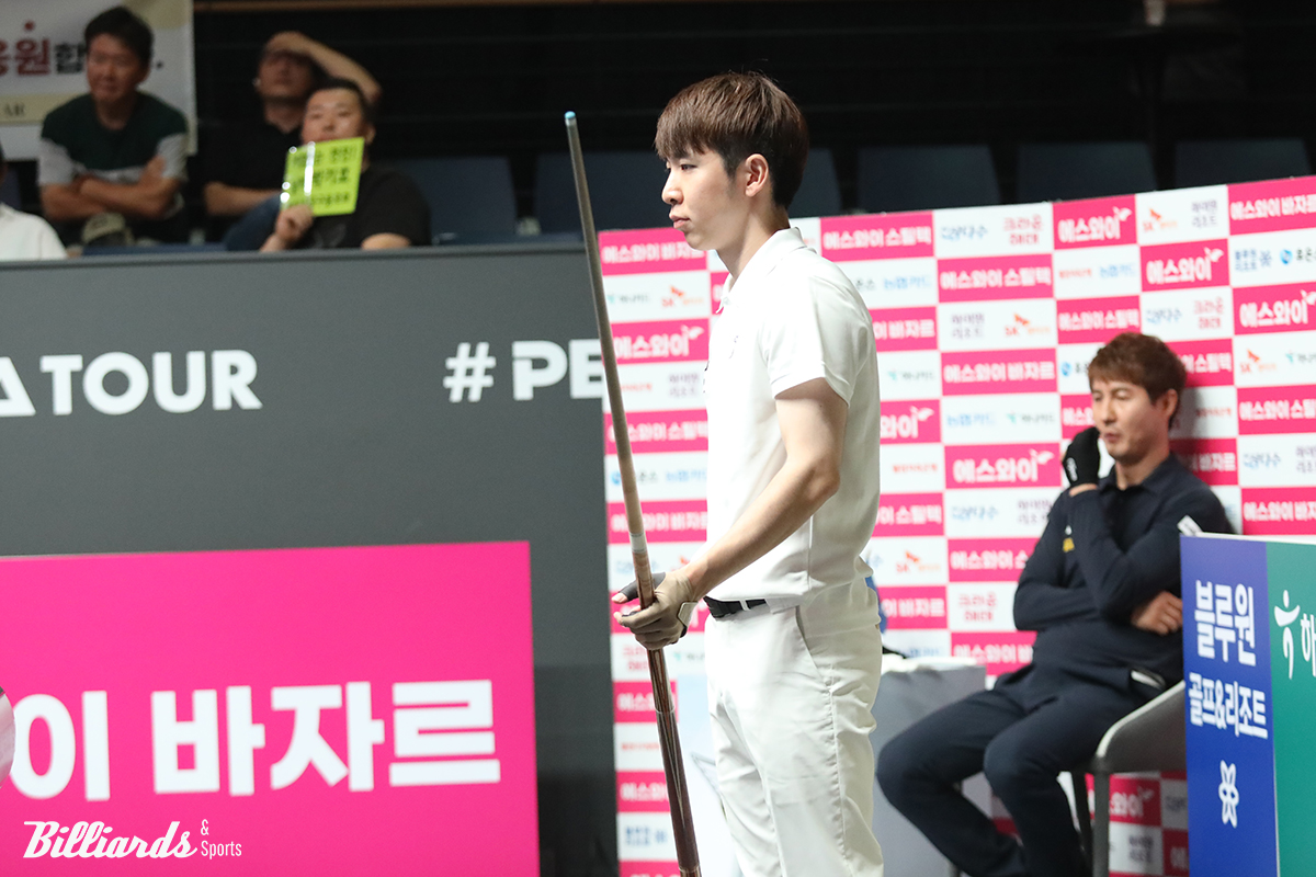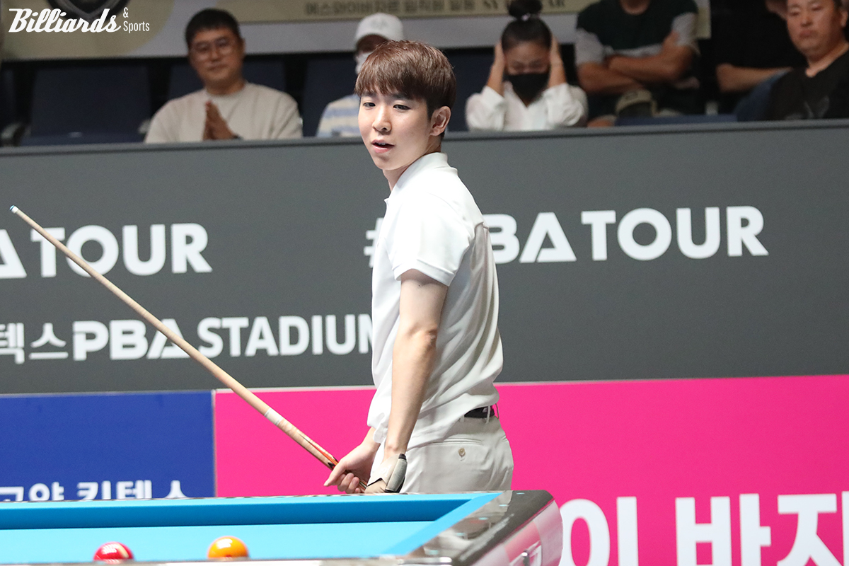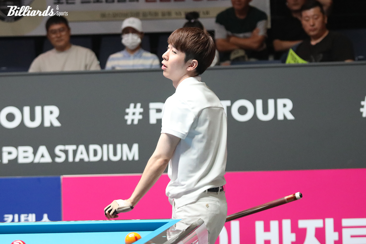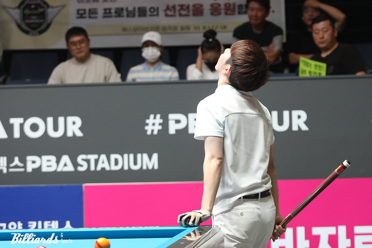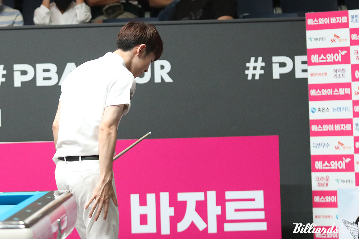 프로당구 PBA 투어 4차전 '에스와이 PBA 챔피언십' 준결승전에서 매치 포인트 샷을 행운의 샷으로 득점하는 모리 유스케(일본).