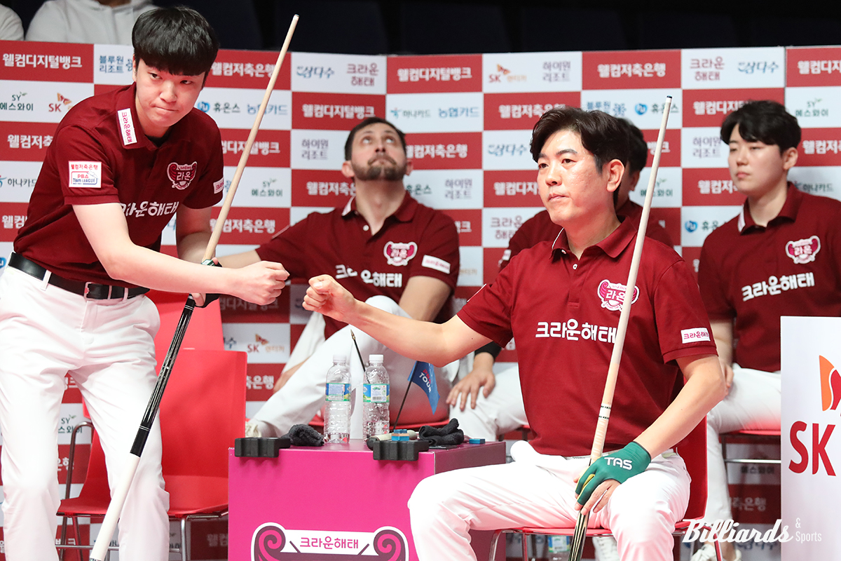 크라운해태가 22일 열린 프로당구 '웰컴저축은행 PBA 팀리그 2023-24' 3라운드 마지막 대결인 9일차 경기에서 1위 팀 NH농협카드를 상대로 1위 도전에 나섰다.