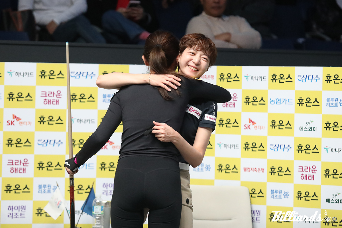 사진은 준결승전이 끝난 후 김가영을 포옹하며 결승 진출을 축하해 주는 임정숙.