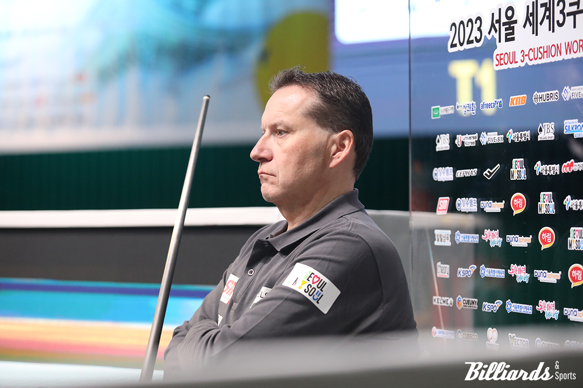 에디 멕스(벨기에)가 마르코 자네티(이탈리아)를 17이닝 만에 50:30으로 제압하고 '2023 서울 세계3쿠션당구월드컵' 결승에 올랐다.