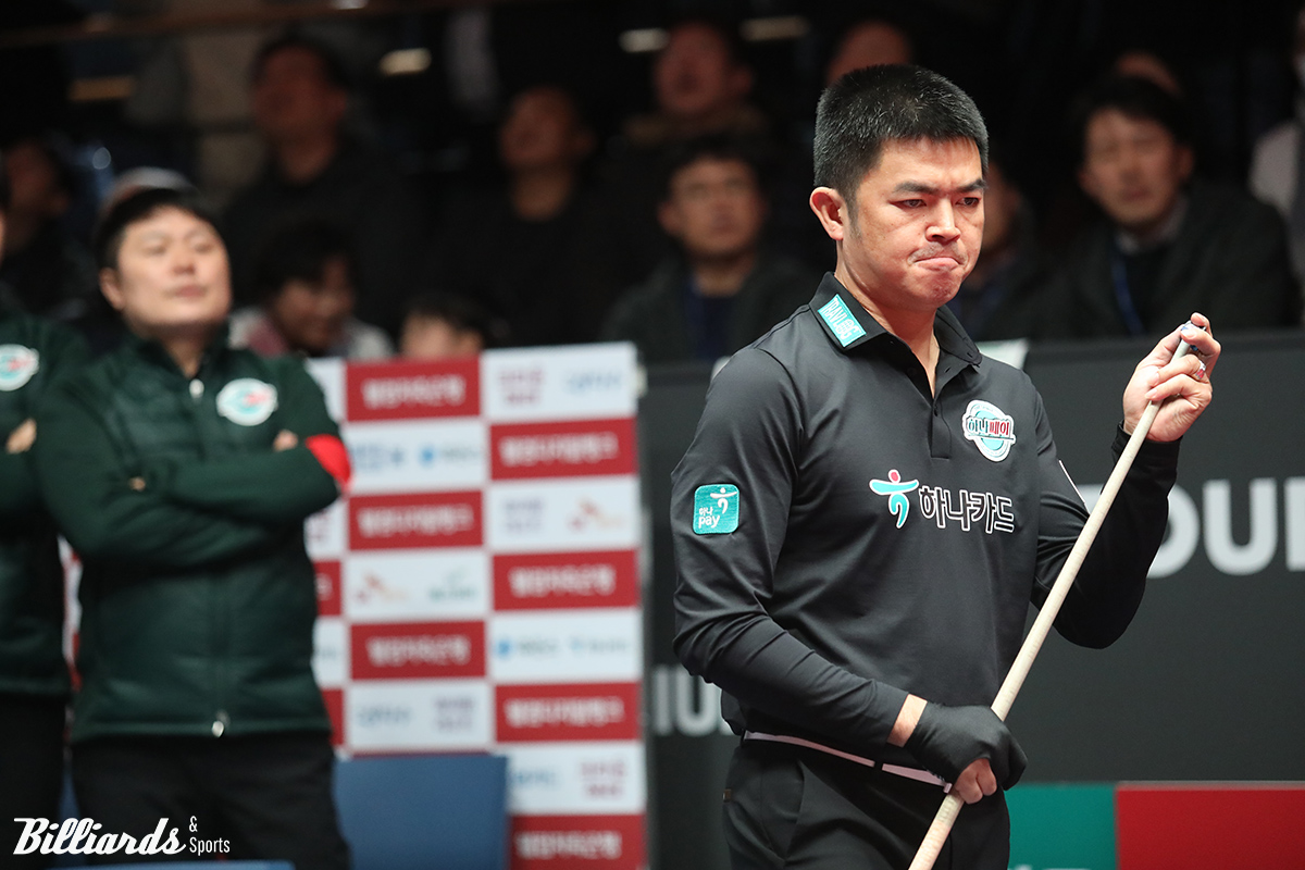 사진은 5세트에 출전한 하나카드의 응우옌꾸옥응우옌(베트남)이 결연한 표정으로 경기에 임하고 있다. 응우옌꾸옥응우옌은 이 경기에서 하이원리조트의 주장 이충복을 11:8(5이닝)로 꺾었다.