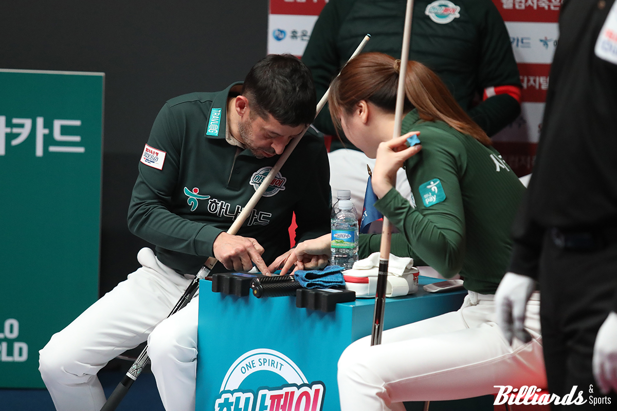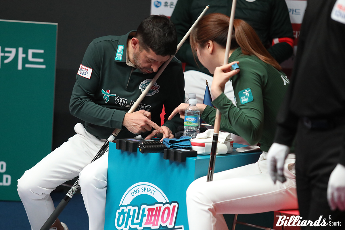 사진은 실패한 샷을 복기 중인 하나카드의 무라트 나지 초클루(튀르키예)와 사카이 아야코(일본)
