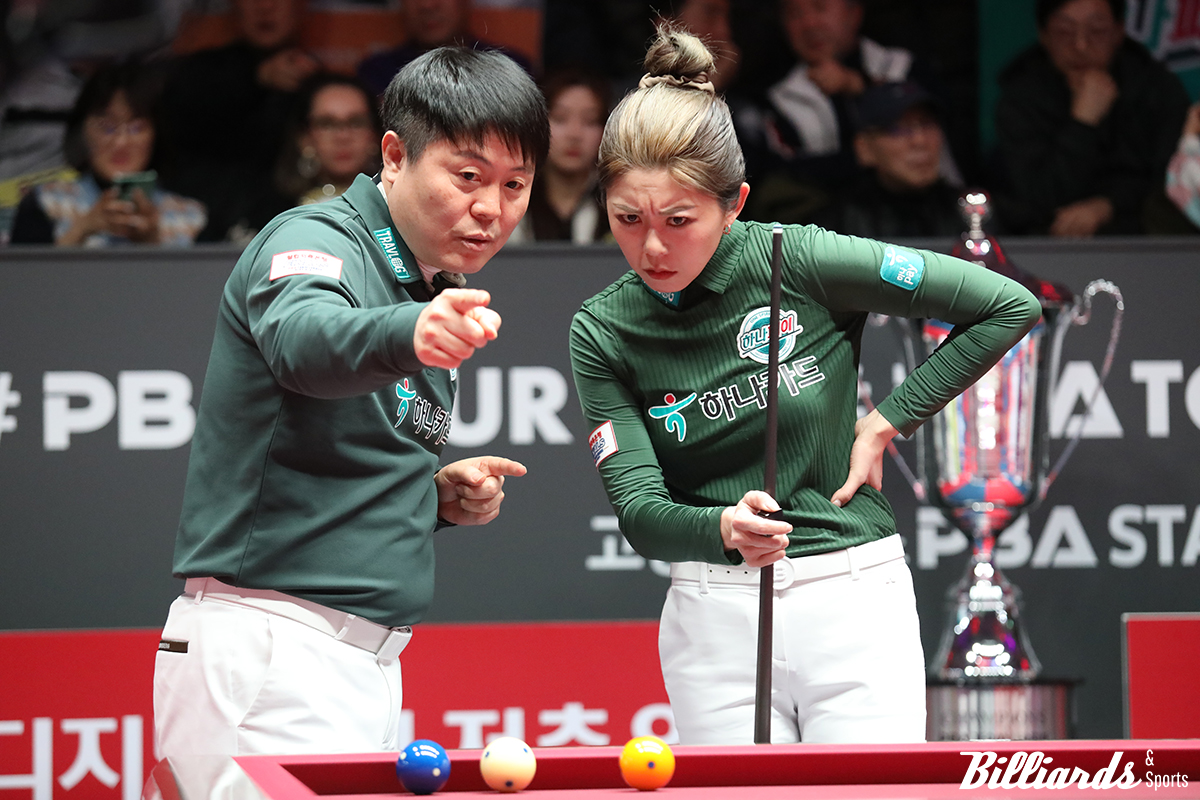 사진은 벤치 타임아웃을 부른 하나카드의 주장 김병호가 김가영에게 무언가 주문을 하고 있다.
