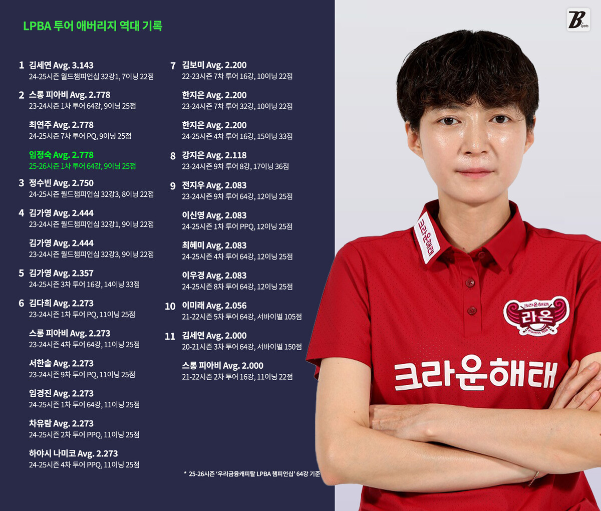 지난 16일 경기도 고양시의 '고양 킨텍스 PBA 스타디움'에서 열린 '우리금융캐피탈 PBA-LPBA 챔피언십 2025' 64강전에서 임정숙은 김보름에게 9이닝 만에 25:6으로 승리하며 2.778을 기록했다.