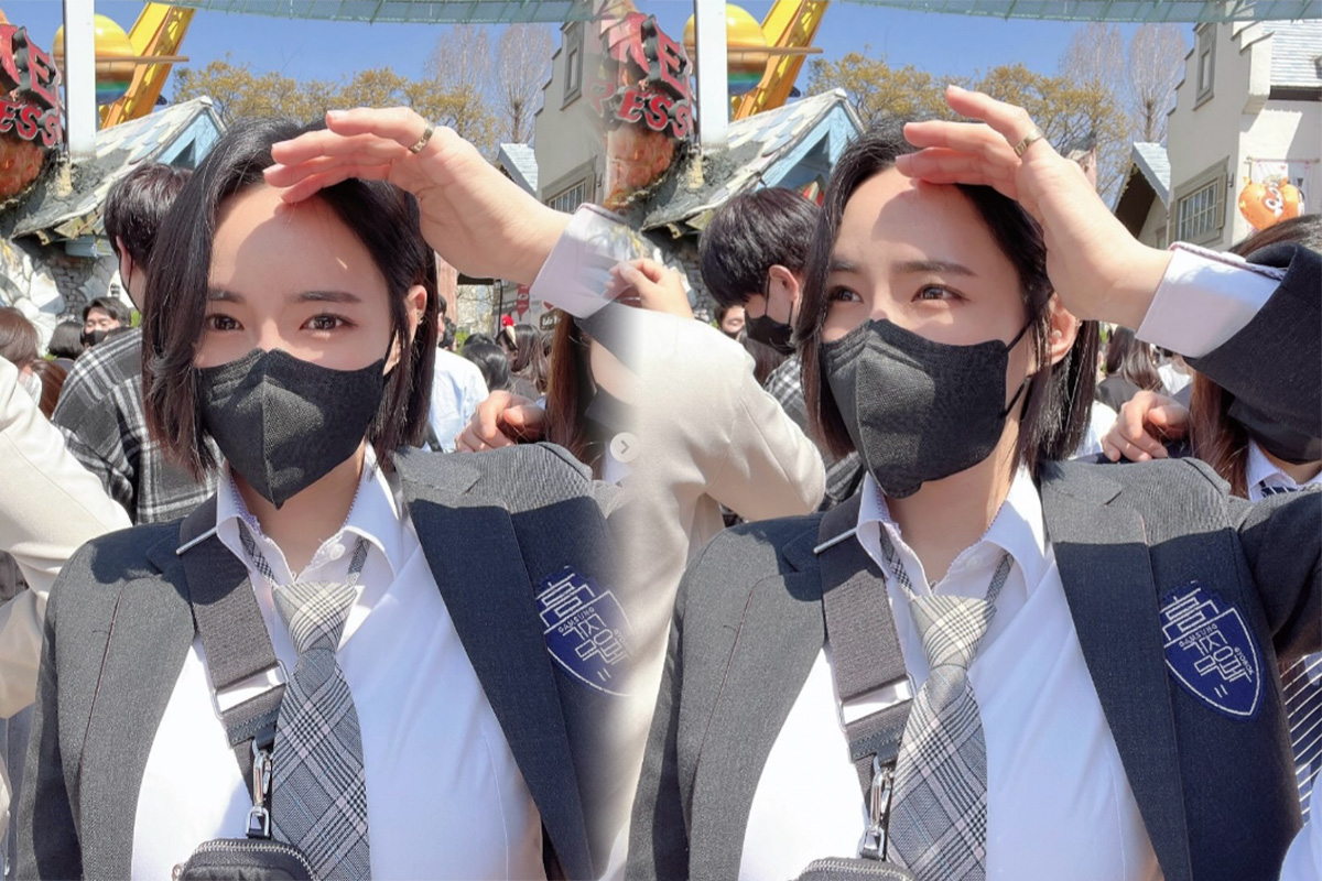 사진의 최혜미는 짧은 단발머리를 하고 놀이동산으로 보이는 곳에서 교복을 입고 있었다.