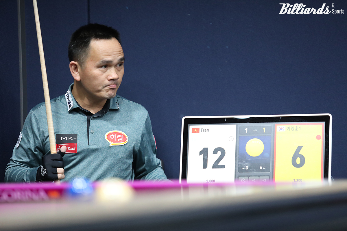 1세트에 이동규는 6:2로 앞선 7이닝 선공에 5점을 치며 11:2까지 크게 리드하다가 후공에서 쩐득민이 무려 4개나 뱅크 샷을 성공시키면서 10점을 맞아 11:12로 역전당했다.