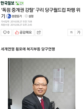 <한국일보 중계권 관련 보도에 대한 사단법인 대한당구연맹의 반박문> 한국일보의 ‘독점 중계권 강탈, 구리 당구월드컵 파행 위기’ 보도 관련, 대한당구연맹에서는 사실관계를 바로 잡습니다 2016년 8월 27일(토) 한국일보는 “2016 구리 3쿠션 월드컵 독점 중계권을 둘러싼 잡음으로 파행 위기에 놓여 있다. 당초 이 대회의 중계권은 대한당구연맹이 빌리어즈TV와 독점계약을 맺으며, 빌리어즈TV에서 중계권을 가지고 있었다. 그러나 세계캐롬당구연맹은 이 대회와 관련하여 국내 모 당구컨텐츠 기업과 2019년까지 또 다른 독점 계약을 맺으면서, 지금까지 개최국 연맹이 가지고 있던 미디어 판권 사업권을 독단적으로 세계캐롬당구연맹(UMB) 소유로 변경하고, 대한당구연맹에 일방적으로 통보하였으며, 대한당구연맹에서는 이러한 UMB의 횡포에도 항의조차 마다한 채 상위 단체의 결정이라 어쩔 수 없다는 식의 복지부동으로 일관하며 부적절한 처신으로 문제를 키웠다. 신임 남삼현 회장은 시작부터 연맹 안팎으로 잡음을 일으키며 수장으로 부적격이라는 비판이 쏟아지고 있다. 정작 대한당구연맹과 독점 중계권 계약을 맺은 빌리어즈TV는 가지고 있는 권리를‘강탈’당했으며, 졸지에 막대한 피해를 입게 됐지만 벙어리 냉가슴이다”라고 보도했으나 이는 사실과 다릅니다. 첫 번째로, 세계3쿠션당구월드컵의 미디어 판권 사업권은 UMB 미디어 규정에 의거한 UMB 고유권리이며, 국내에서 월드컵 개최 시에는 우리 연맹은 국내 방송 1개사(지상파, 케이블, 위성)를 선정할 권리를 가지고 있습니다. 따라서, 미디어 판권 사업권을 독단적 UMB 소유로 변경했다는 것은 근거가 전혀 없음을 알려드립니다. 두 번째로, 2016 구리 세계3쿠션당구월드컵의 중계권은 우리연맹과 맺은 계약에 의해 빌리어즈TV에 부여는 할 수 있지만 독점적 중계권은 아닙니다. 따라서 빌리어즈TV에서 독점 중계권을 ‘강탈’당하고 졸지에 막대한 피해를 입게 됐다는 보도는 사실이 아니라는 점을 밝힙니다. 세 번째로, UMB에서 사전에 회원국들에 고지 없이 새로운 계약을 맺은 것은 맞습니다. 하지만 신임 남삼현 회장은 선출(2016년 8월 1일) 후 이 부분에 대해 보고 받은 즉시 각 국가별로 중계권에 혼란이 있을 수 있는 새로운 계약을 함에 있어 각 회원국에 사전에 고지하지 않은 부분에 대해 UMB에 유감을 표명하였으며, 8월 29일부터 시작하는 월드컵 전에 이 부분에 대한 공식적인 회의를 요청하였고, 현재 다양한 부분에 대해 논의를 진행 중에 있습니다. 따라서 UMB의 결정에 대해 복지부동으로 일관하며 부적절한 처신으로 문제를 키웠다는 보도는 사실과 다름을 알려드립니다. 마지막으로 신임 집행부가 선임된 지 불과 20일도 되지 않은 시점에서 지금 이 시간까지 연맹으로 어떠한 경로로도 비판이나 민원상황이 발생하지 않고 있음에도 불구하고 안팎으로 잡음을 일으키며 수장으로 부적격이라고 비판이 쏟아지고 있다는 지적에 대해 어떠한 근거도 없음을 알려드립니다. |