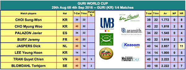 2016 구리 3쿠션 월드컵 4강은 조명우 vs 제러미 뷰리, 딕 야스퍼스 vs 트란퀴엣치엔의 4파전으로 압축됐다.