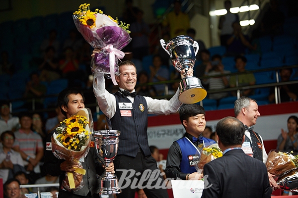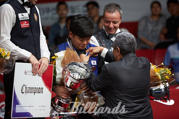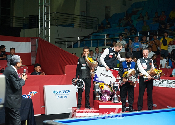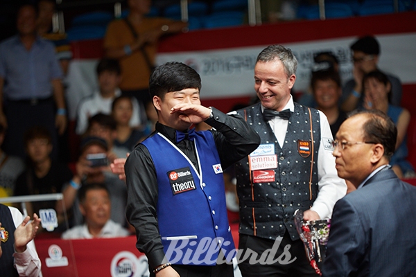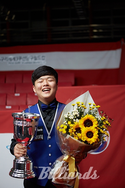 이번 월드컵에서 '조명우 폭풍'을 일으키며 전 세계 당구팬들에게 눈도장을 제대로 찍은 조명우(18∙매탄고)는 딕 야스퍼스(네덜란드, 세계랭킹 4위)와 나란히 시상대에 올라 감격스러운 표정을 감추지 못했다.