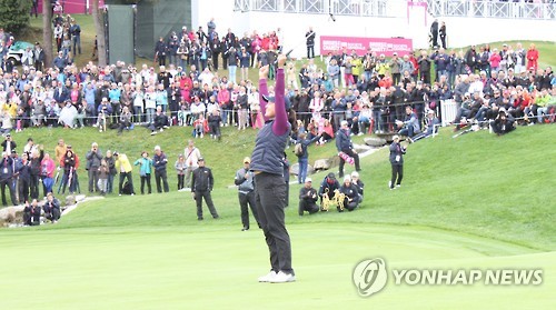 전인지는 18번홀(파4)에서 티샷이 깊은 러프에 떨어지는 바람에 세 번 만에 그린에 올라왔지만 3m 파퍼트를 기어이 집어넣고 두팔을 높이 쳐들고 환호했다.
