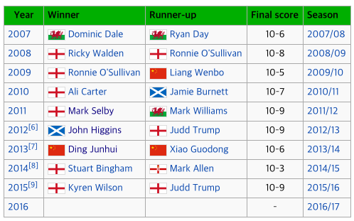 지난 시즌 상하이 마스터스에서는 당시 세계 랭킹 54위에 불과했던 카렌 윌슨(24, 잉글랜드)이 결승전에서 세계 랭킹 4위 주드 트럼프(27, 잉글랜드)를 10-9로 꺾고 생애 첫 랭킹 토너먼트 우승을 차지했다.