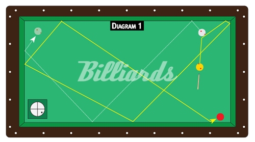 제1적구의 선택을 어떻게 하느냐에 따라 다른 시스템을 적용할 수 있는 예이다. 아래 그림의 노란공이 수구일 때 제1목적구를 흰공으로 선택할 경우 Diagram 1과 같은 제각돌리기 대회전 시스템을 적용할 수 있고, 빨간공을 선택했을 경우에는 Diagram 2, Diagram 3과 같이 비껴치기 시스템을 적용할 수 있다. 이 세 가지 시스템 공략법에 대해 알아보도록 하자.