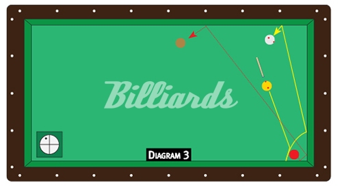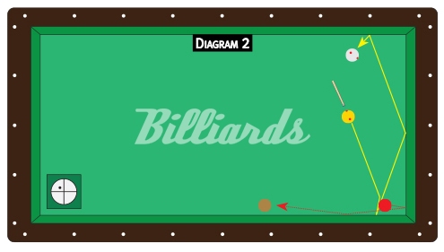 Diagram 2는 제1적구로 빨간공을 선택해서 1/3 두께로 얇게 비껴치기를 시도하는 것이다.