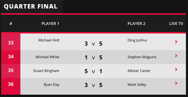 또한, 빙햄은 알리 카터에게 5-1로 승리해 준결승전에 진출했고 맥과이어도 마이클 화이트를 5-1로 꺾었다.