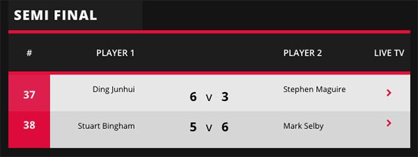 24일 벌어진 4강 제1경기 마크 셀비 vs 스튜어트 빙햄의 세계랭킹 1, 2위 간의 대결에서 셀비는 풀 프레임 접전 끝에 6-5로 빙햄을 꺾고 결승에 진출했다.