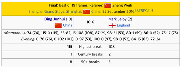 딩준후이는 25일 열린 상하이 마스터스 결승전에서 스누커 세계 랭킹 1위 마크 셀비에게 10-6으로 승리를 거두고 상하이 마스터스에서 최초로 2회 우승을 차지한 선수가 되었다.