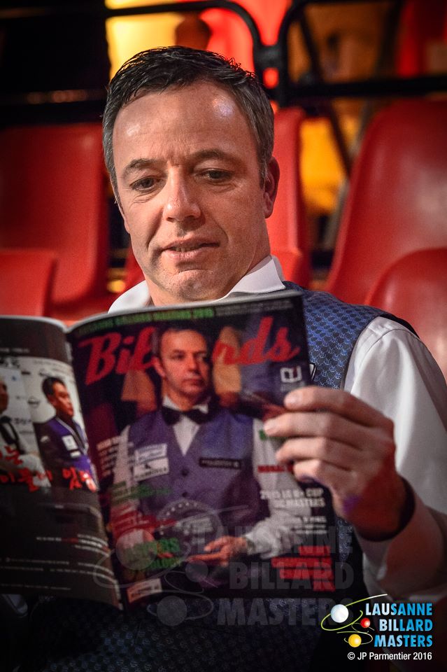 디펜딩 챔피언인 딕 야스퍼스가 지난 대회 우승자로 '빌리어즈' 표지를 장식했던 자신의 기사를 읽고 있다. (사진 = JP PARMENTIER / 로잔마스터스 페이스북)