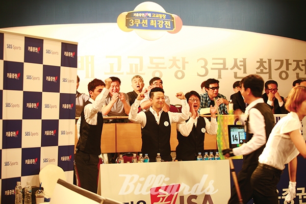 지난 6월 19일 ‘키움증권배 고교동창 3쿠션 최강전’의 결승전 모습이다. 순천고의 우승이 확정되자 객석에서 동창들이 교가를 부르며 우승의 감격을 배가시켰다.