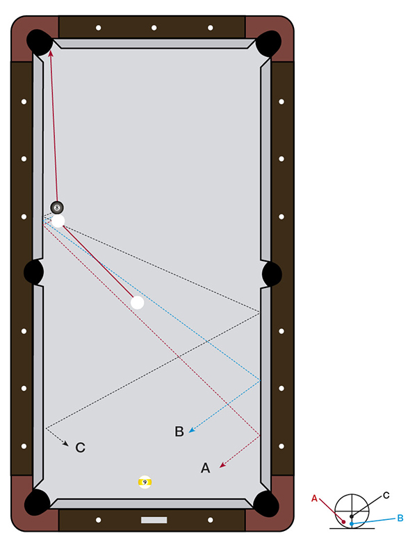 세 번째는 스톱 샷 당점으로 끌어치기해 입사각을 줄여서 반사각을 나타내는 포지션 플레이 형태인데, 조금 어려운 타법이므로 연습을 많이 해야 한다.