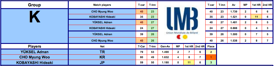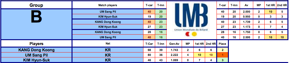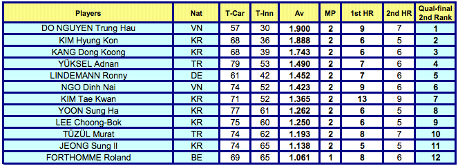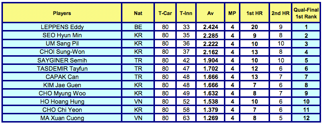 한국시간으로 25일 오후 10시경에 끝난 최종 예선에서 서현민(애버리지 2.285), 엄상필(2.222), 최성원(2.162) 등이 나란히 2점대 애버리지를 기록하며 전체 순위 2, 3, 4위를 차지했다.