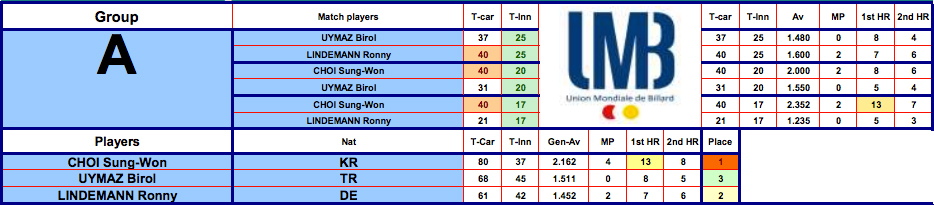 A조에서 비롤 위마즈(터키), 로니 린데만(독일) 등과 대결한 최성원은 위마즈를 40:31(20이닝, H.R. 8점), 린데만을 40:21(17이닝, H.R. 13점)로 누르고 A조 1위로 최종 예선을 통과했다.