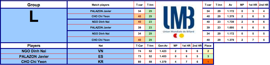 응오딘나이(베트남), 하비에르 팔라존(스페인) 등 강자들과 L조에 속한 조치연은 각각 29이닝 만에 40:34로 승리를 거두고 32강에 이름을 올렸다.