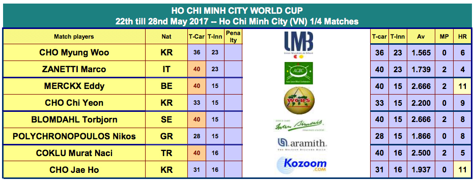 5월 27일 오후 5시(한국시각)에 시작된 8강전에서 조재호(38∙서울시청), 조치연(44∙서울시당구연맹), 조명우(19∙한체대) 등 한국 선수들이 모두 패해 준결승 진출이 좌절됐다.