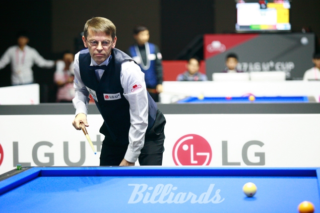 [빌리어즈=서울/김민영 기자] '2017 LG U+컵 3쿠션 마스터스' 본선 토너먼트 8강전에서 '당구 황제' 토브욘 블롬달이 샷을 한 뒤 득점을 신중하게 지켜보고 있다.