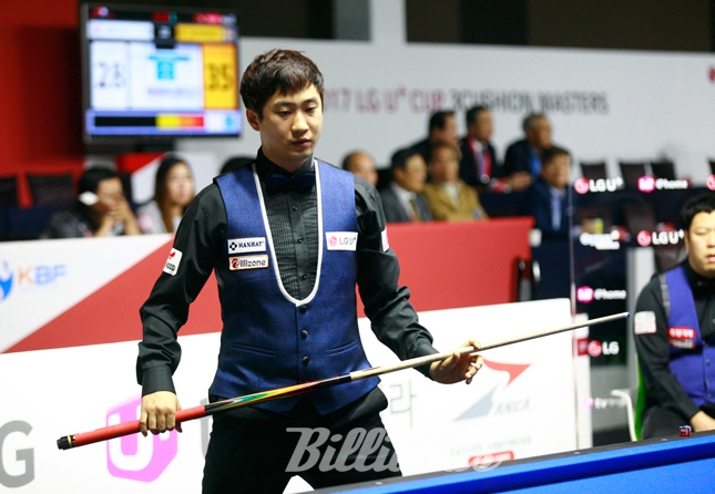 [빌리어즈=서울/김민영 기자] '2017 LG U+컵 3쿠션 마스터스' 본선 토너먼트 8강전에서 한국 선수 3명 중 유일하게 4강에 진출한 홍진표가 강동궁과의 8강전에서 다음 포지션을 생각하고 있다. 홍진표는 이 경기에서 강동궁을 40:33(17이닝)으로 꺾고 '4강 돌풍'을 일으켰다.