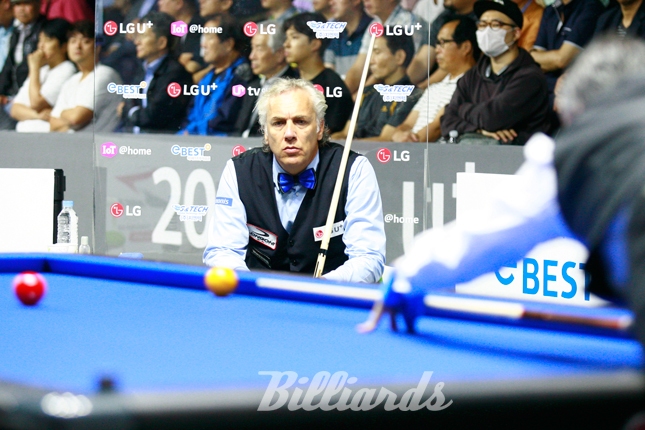 [빌리어즈=서울/김민영 기자] '2017 LG U+컵 3쿠션 마스터스' 본선 토너먼트 8강전에서 마르코 자네티가 딕 야스퍼스의 샷을 지켜보고 있다.