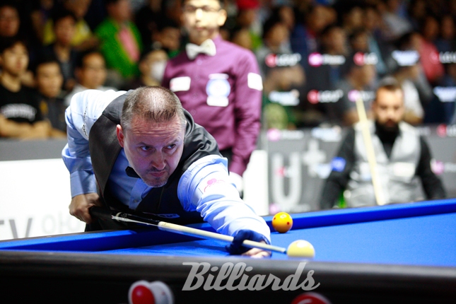 [빌리어즈=서울/김민영 기자] '2017 LG U+컵 3쿠션 마스터스' 본선 토너먼트 8강전에서 프레데릭 쿠드롱이 다음 공을 시도하고 있다.