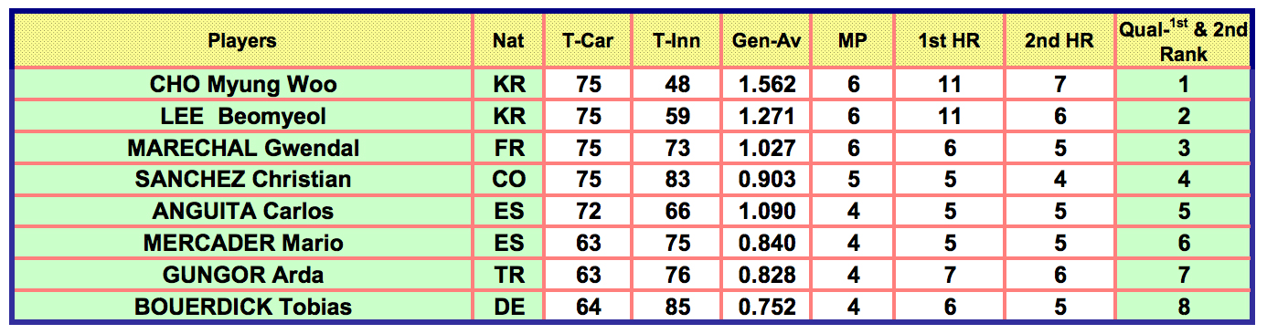 조명우는 예선 리그 3경기 합산 애버리지 1.562로 전체 1위에 올랐다.
