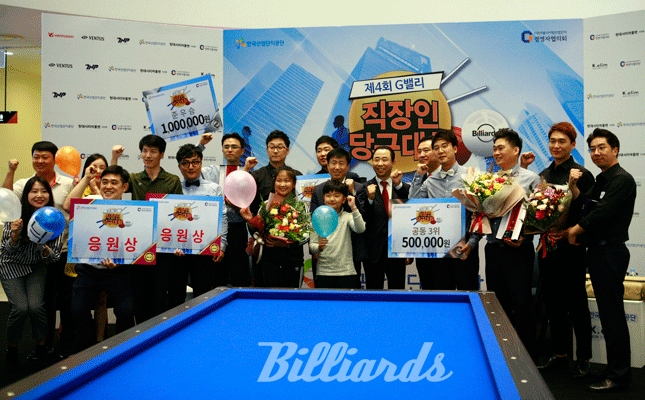 [빌리어즈=서울/김민영 기자] '제4회 G밸리 직장인당구대회'가 지난 21일 개최되었다. 한국산업단지공단과 서울디지털산업단지경영자협의회가 주최하고 대한직장인당구협회와 (주)타임앤플레이스가 주관하는 이번 대회는 (주)탑테크이십일의 어마어마팀(박영욱∙남궁혁)이 우승을 차지했다.
