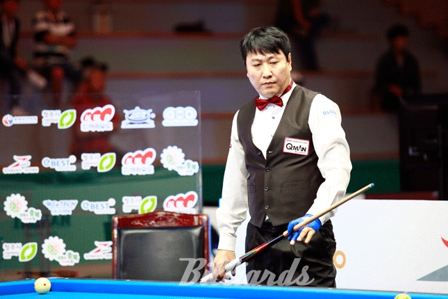 [빌리어즈=청주/김민영 기자] '2017 청주직지 3쿠션 월드컵'에 출전한 신남호(대전당구연맹)가 예선 1라운드 PPPQ 첫 경기에서 샷을 준비하고 있다. 신남호는 임정민(강원당구연맹)에게 30:28로 승리했다.