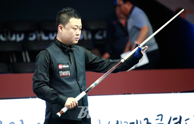 [빌리어즈=청주/김민영 기자] '2017 청주직지 3쿠션 월드컵' 예선 1라운드 PPPQ에서 임정민이 큐를 들고 신중하게 다음 포지션을 생각하고 있다. 임정민은 예선 1라운드 L조에서 신남호, 일본의 가와모토 아키라와 대결한다.