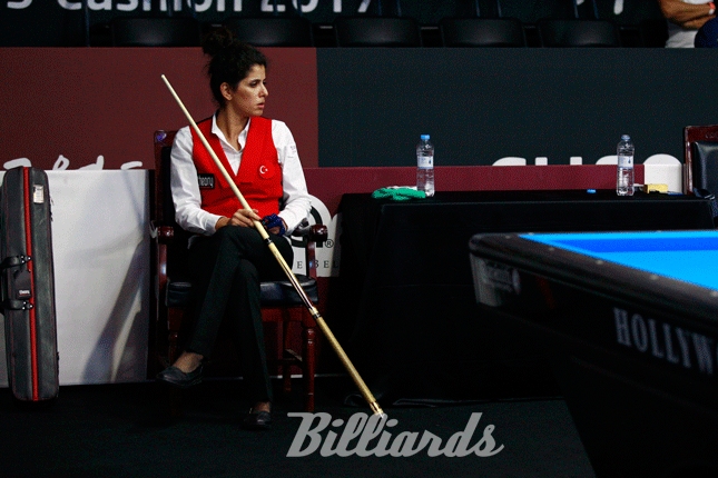 [빌리어즈=청주/김민영 기자] '2017 청주직지 3쿠션 월드컵' 예선 1라운드 PPPQ에 터키의 여자 3쿠션 선수 구진 뮈즈데 카라카슬리가 출전했다. 카라카슬리는 E조에서 한국의 성상은(경기당구연맹)과 라몬 아비올(스페인) 등 남자 선수들과 대결한다.