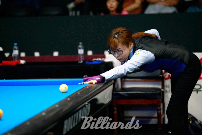 [빌리어즈=청주/김민영 기자] 여자 3쿠션 국내 최강자인 이신영(경기도당구연맹)이 '2017 청주직지 3쿠션 월드컵' 예선 1라운드 PPPQ에 출전했다. 사진은 독일의 프랭크 스프루지나와의 첫 경기에서 스트로크하는 이신영.