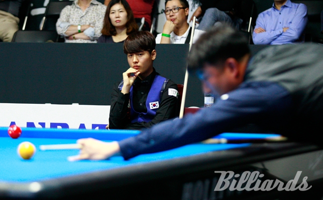 [빌리어즈=청주/안소영 기자] '2017 청주직지 3쿠션 월드컵' 최종 예선 Q라운드에 출전한 '당구 아이돌' 신정주(부산당구연맹)가 28일 첫 경기에서 '터미네이터' 이충복과 대결했다. 경기는 25이닝 만에 40:26으로 이충복이 승리했다.