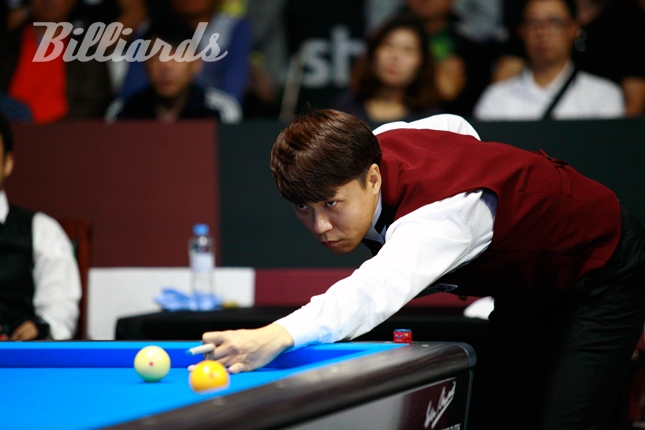 [빌리어즈=청주/김민영 기자] '2017 청주직지 3쿠션 월드컵' 최종 예선 Q라운드에 출전한 세계 3쿠션 챔피언 최성원(부산시체육회)이 28일 오후 1시에 시작된 첫 경기에서 애버리지 2.105로 일본의 다나카 준을 잡았다.