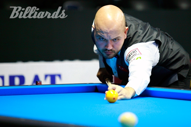 [빌리어즈=청주/김민영 기자] 터키의 비롤 위마즈가 '2017 청주직지 3쿠션 월드컵' 최종 예선 Q라운드를 1승 1무로 통과했다. 위마즈는 한국의 김현우와 첫 경기를 40:40(21이닝)으로 비겼으나, 다음 경기에서 에디 레펜스(벨기에)를 24이닝 만에 40:39, 간발의 차로 꺾고 조 1위에 올랐다.