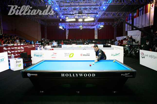 [빌리어즈=청주/김민영 기자] '2017 청주직지 3쿠션 월드컵' 16강전에 출전한 조재호(37∙서울시청)가 경기에 앞서 당구대 컨디션을 체크하며 연습하고 있다. 조재호는 16강전에서 베트남의 즈엉안부(37)와 격돌한다.