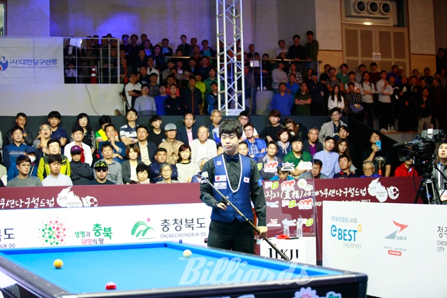 [빌리어즈=청주/김민영 기자] '2017 청주직지 3쿠션 월드컵' 준결승전에 출전한 김행직(25∙전남당구연맹)이 당구대 앞에서 다음 공을 신중하게 생각하고 있다. 김행직은 터키의 뤼피 제넷과 지난 7월 포르토 월드컵에 이어 준결승전에서 다시 한번 대결한다.